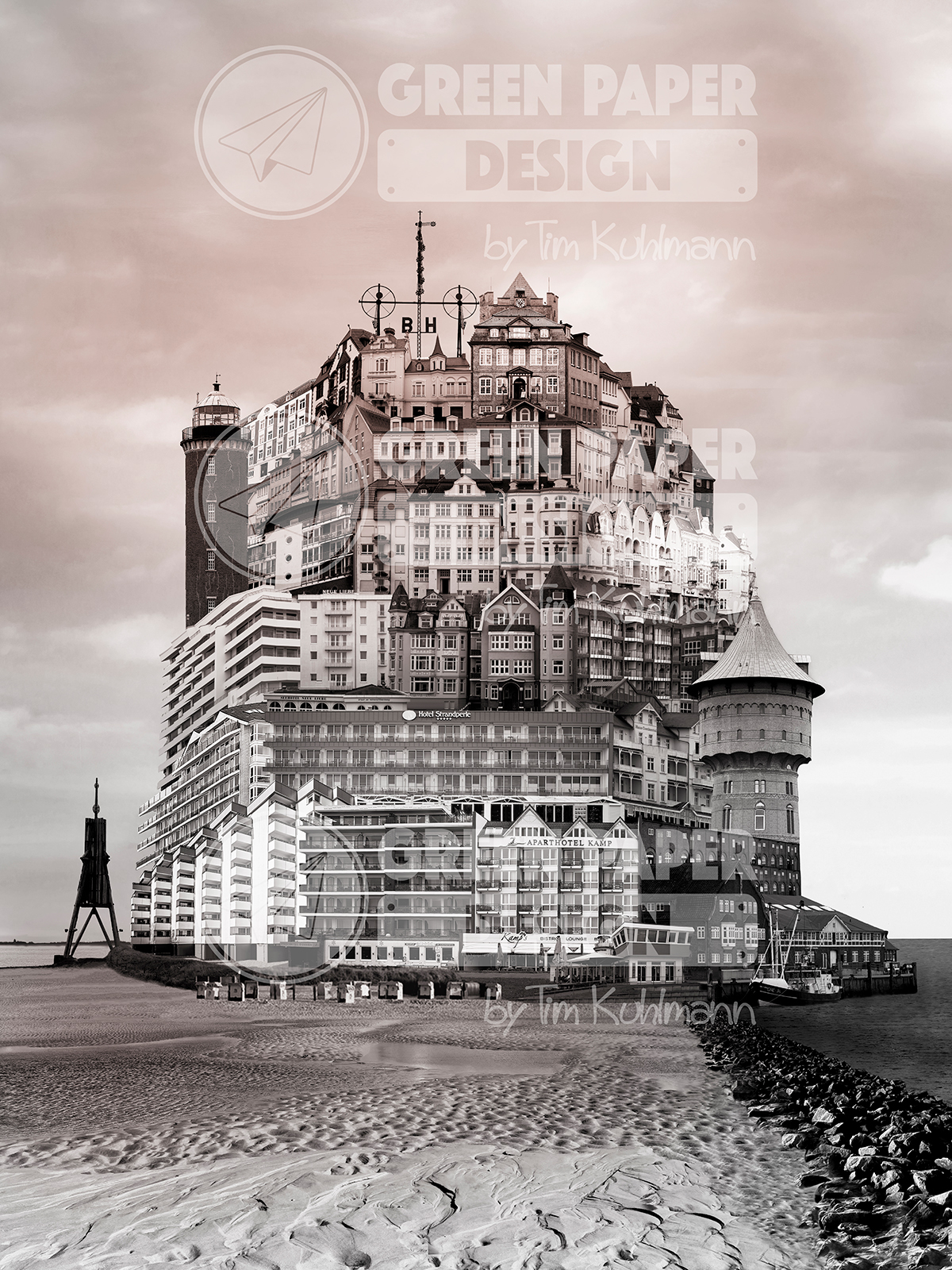 Diese beeindruckende Fotomontage vereint alle Wahrzeichen und charakteristischen Ecken von Cuxhaven in einem einzigartigen Kunstwerk. Inspiriert vom Mont St. Michel, zeigt das Bild das Watt im Vordergrund und das Wasser auf der rechten Seite und stellt so die dynamischen Gezeiten dar. Erleben Sie die Schönheit und Vielfalt von Cuxhaven auf Aluminium Dibond – ein besonderes Highlight für Ihr Zuhause.